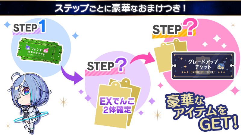 ステップを重ねていくと、エクストラシリーズのでんこが最大2体確定するガチャを引くことができるほか、「グレードアップチケット」などのアイテムがおまけでゲットできるんだとか……!