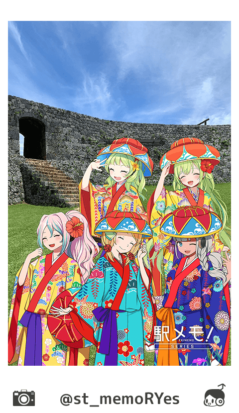 祭り囃子が聞こえてきて今にも踊りだしそうな1枚。沖縄の風景と、琉球を思わせる鮮やかな衣装がおそろいのでんこたち。お祭りを満喫したあとなのでしょうか? 素敵な笑顔を見せてくれていますね♪