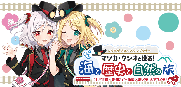 「マツカ」と「ウシオ」のにしがま線応援特使および愛知こどもの国の公認キャラクター就任を記念して、名古屋鉄道西尾線・蒲郡線の駅を巡るデジタルスタンプラリーを開催します♪ ミッション対象の駅やスポットにチェックインするとゲーム内アイテムを獲得できます!