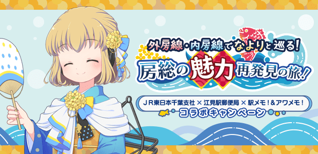 なよりの『JR東日本 千葉支社公認「キャンペーンPR大使」』の就任を記念して、JR外房線・内房線の駅や沿線の観光地を巡るスタンプラリーイベントを開催♪ 対象駅や対象スポットにチェックインするとゲーム内アイテムを獲得できるほか、全ミッションクリアでなよりの記念フィルム 「萬祝染風の着物のなより」が報酬として獲得できます!