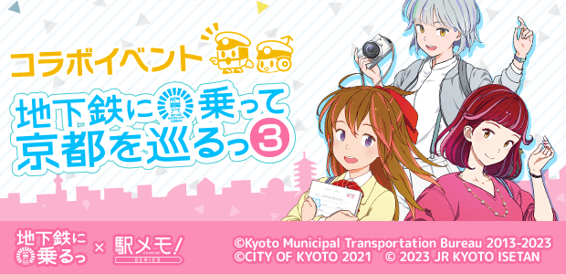 京都市営地下鉄烏丸線・東西線の全駅と「ジェイアール京都伊勢丹」を対象としたデジタルスタンプラリーを開催します♪ ミッション対象の駅やスポットにチェックインするとゲーム内アイテムを獲得できます! すべてのミッションをクリアすると、好きな「地下鉄に乗るっ」コラボでんこを選んでGETすることが出来る 「京都まんきつきっぷ」をGETできちゃいますよ♪