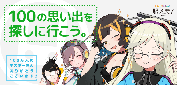 マスター100万人の突破を記念して、100箇所の駅の思い出を探しに行くイベントを開催! 期間中にアクセスした駅が100駅に到達すると、いつもより特別なスカウトチケットがもらえます。